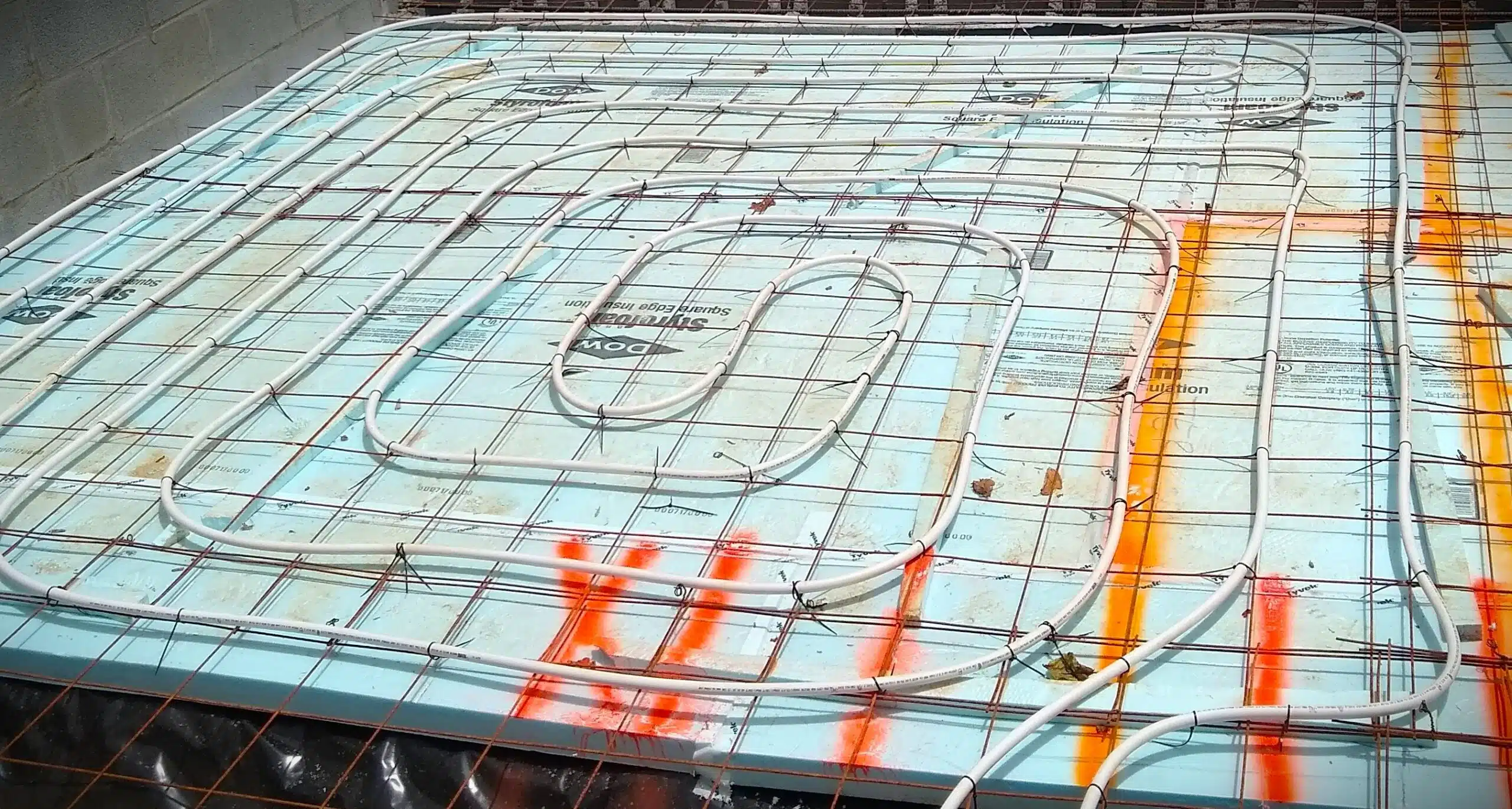 For basements and areas where a concrete slab is being poured, we run tubing for the radiant floor system before the concrete is poured. Tubing is attached to the reinforcing wire mesh or rebar. The concrete is poured so that the tubing is embedded into the concrete slab.
